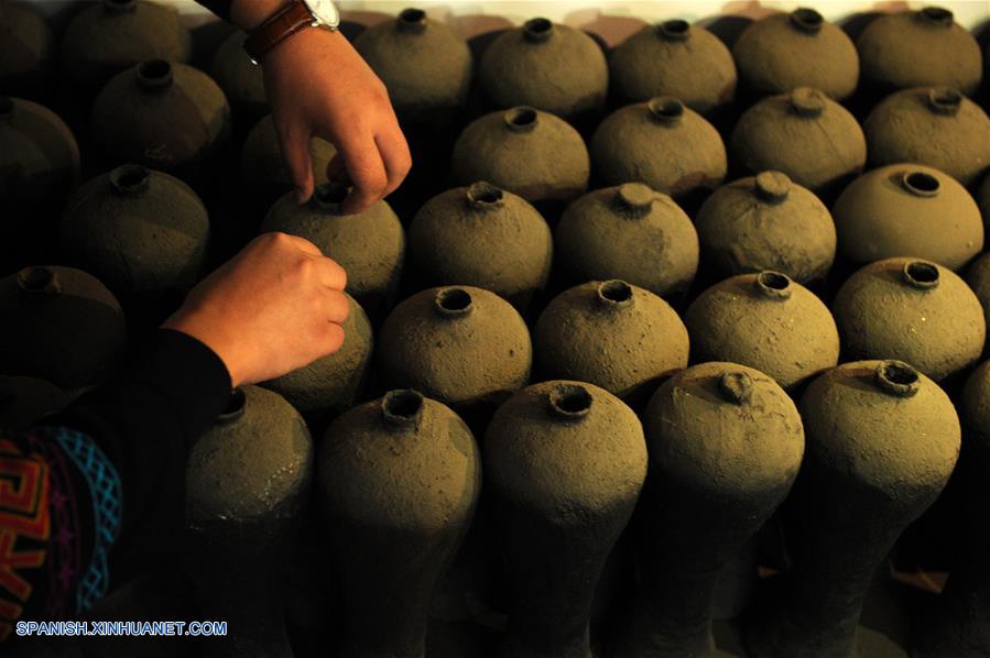 GUIZHOU, septiembre 11, 2018 (Xinhua) -- Imagen del 10 de septiembre de 2018 de un artesano secando los trabajos de laca, en el condado de Dafang, provincia de Guizhou, en el suroeste de China. El trabajo de laca producido en el condado de Dafang es hecho a mano a través de todos los procedimientos y requiere altos estándares. La técnica de fabricación sólo puede obtenerse de un artesano experimentado. Hoy en día, el gobierno local ha establecido estudios e introducido la artesanía en las tiendas en línea para la herencia del arte. (Xinhua/Yang Wenbin)
