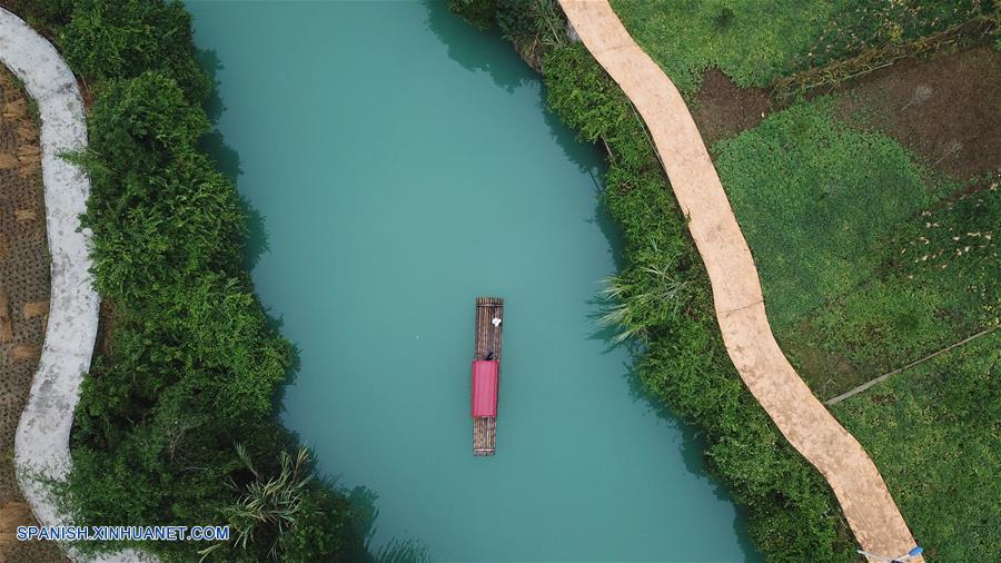GUIZHOU, septiembre 12, 2018 (Xinhua) -- Vista aérea de una balsa de bambú transportando turistas en el punto escénico de Daxiaojing, en el condado de Luodian, provincia de Guizhou, en el suroeste de China, el 12 de septiembre de 2018. (Xinhua/Ou Dongqu)