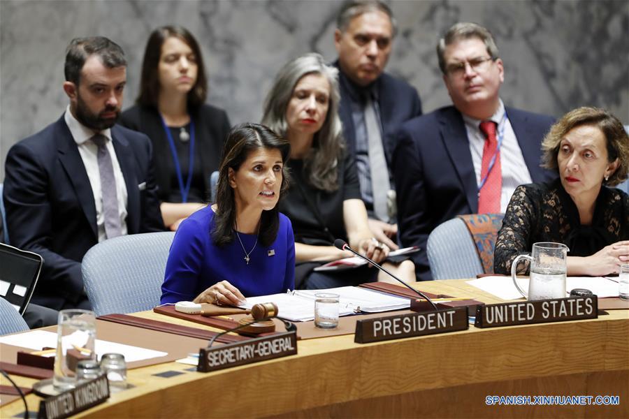 La embajadora de Estados Unidos ante la Organización de las Naciones Unidas (ONU), Nikki Haley (i-frente), participa durante un debate abierto del Consejo de Seguridad de la ONU sobre operaciones de mantenimiento de paz, en la sede de la ONU en Nueva York, Estados Unidos, el 12 de septiembre de 2018. El subsecretario general de la ONU para Operaciones de Mantenimiento de Paz, Jean-Pierre Lacroix, exhortó el miércoles a los Estados miembros a aportar más tropas y policías para el mantenimiento de paz de la ONU. (Xinhua/Li Muzi)
