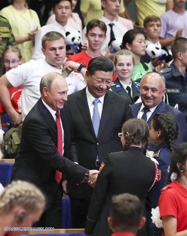 VLADIVOSTOK, septiembre 12, 2018 (Xinhua) -- El presidente de China, Xi Jinping y el presidente ruso, Vladimir Putin, conversan con ni?os en el Centro Infantil de Toda Rusia "Océano" mientras asisten a los eventos conmemorativos del décimo aniversario de que el centro recibió a cientos de ni?os chinos de regiones afectadas por un letal sismo en 2008, en Vladivostok, Rusia, el 12 de septiembre de 2018. (Xinhua/Xie Huanchi)