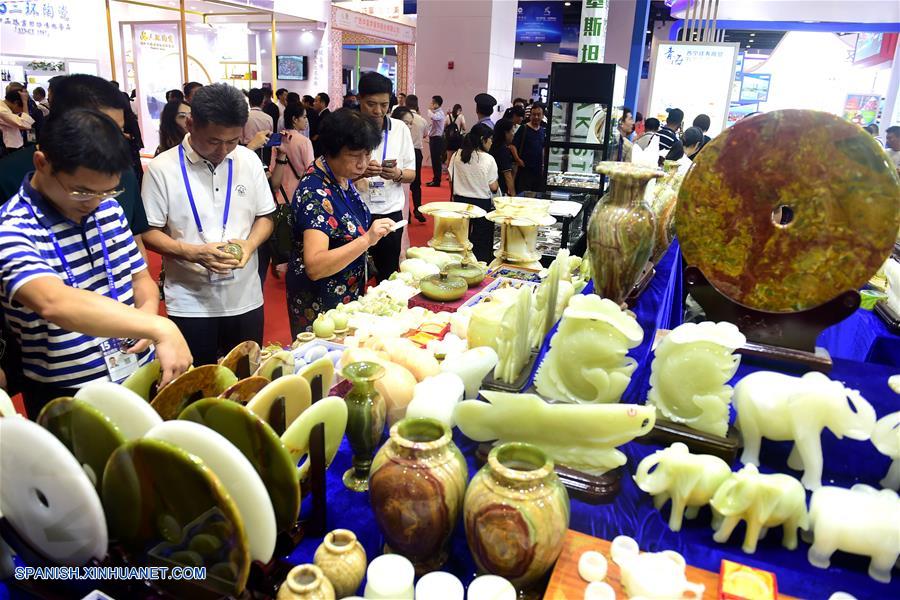 GUANGXI, septiembre 12, 2018 (Xinhua) -- Personas seleccionan artículos de jade en la sala de exposiciones de la 15 Exposición China-ASEAN (Asociación de Naciones del Sudeste Asiático), en Nanning, capital de la Región Autónoma Zhuang de Guangxi, en el sur de China, el 12 de septiembre de 2018. La 15 Exposición China-ASEAN se inauguró el miércoles en la ciudad sure?a china de Nanning. (Xinhua/Zhao Dingzhe)