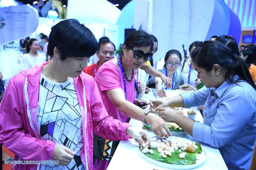 GUANGXI, septiembre 12, 2018 (Xinhua) -- Personas prueban fruta de Tailandia en la sala de exposiciones de la 15 Exposición China-ASEAN (Asociación de Naciones del Sudeste Asiático), en Nanning, capital de la Región Autónoma Zhuang de Guangxi, en el sur de China, el 12 de septiembre de 2018. La 15 Exposición China-ASEAN se inauguró el miércoles en la ciudad sure?a china de Nanning. (Xinhua/Zhou Hua)