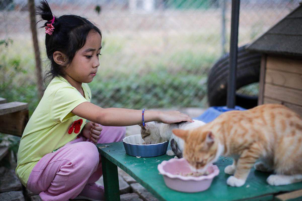 Algunos jóvenes estudiantes junto con sus padres también se unen al equipo de amantes de los gatos para cuidar a los gatos juntos. [Foto de Tang Tao para chinadaily.com.cn]