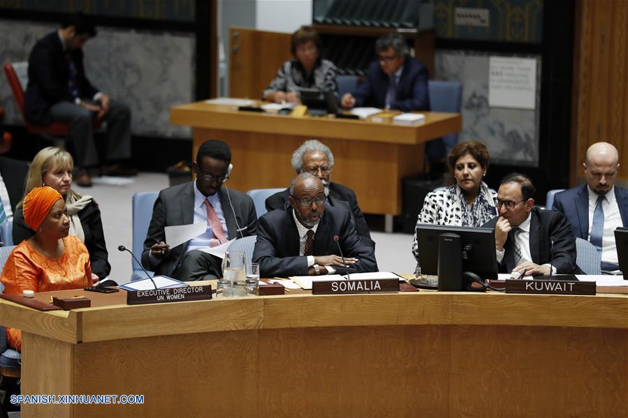 NUEVA YORK, septiembre 13, 2018 (Xinhua) -- El representante permanente de Somalia ante la Organización de las Naciones Unidas (ONU), Abukar Dahir Osman, participa durante una reunión del Consejo de Seguridad de la ONU, sobre la situación en Somalia, en la sede de la ONU, en Nueva York, Estados Unidos, el 13 de septiembre de 2018. El enviado saliente de la ONU para Somalia, Michael Keating, advirtió el jueves que el terrorismo y las diferencias políticas harán fracasar el progreso en Somalia. (Xinhua/Li Muzi)