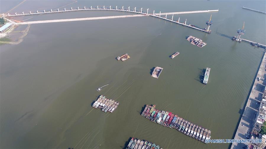 Embarcaciones pesqueras son resguardadas en un puerto en Maoming, provincia de Guangdong, en el sur de China, el 15 de septiembre de 2018. Se espera que Mangkhut toque tierra la tarde o noche del domingo en las áreas costeras entre Zhuhai y Zhanjiang, provincia de Guangdong, sur de China, provocando vientos fuertes de 45 a 52 metros por segundo, se?aló el Centro Meteorológico Nacional (CMN). (Xinhua/Zhang Jiayang)