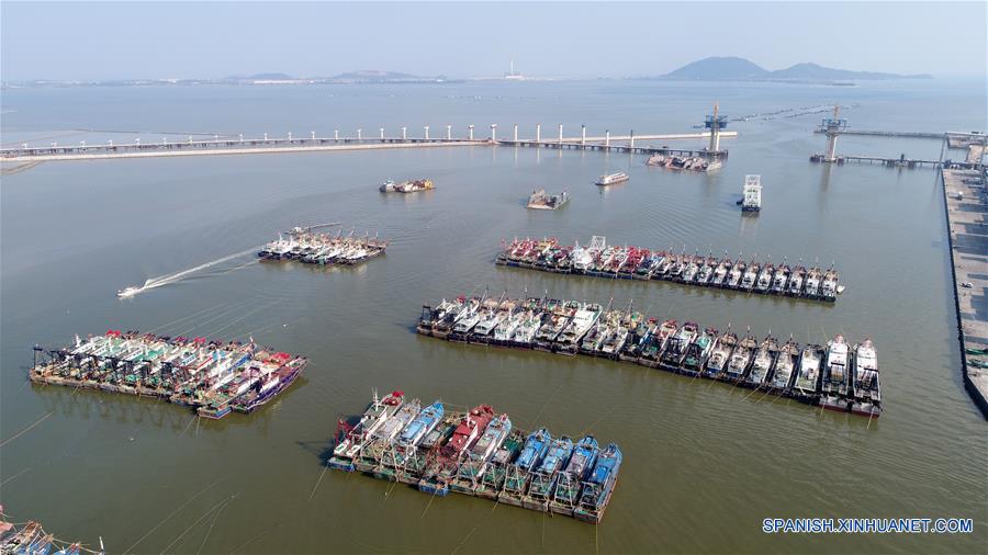Vista aérea de las embarcaciones pesqueras resguardadas en un puerto en Maoming, provincia de Guangdong, en el sur de China, el 15 de septiembre de 2018. Se espera que Mangkhut toque tierra la tarde o noche del domingo en las áreas costeras entre Zhuhai y Zhanjiang, provincia de Guangdong, sur de China, provocando vientos fuertes de 45 a 52 metros por segundo, se?aló el Centro Meteorológico Nacional (CMN). (Xinhua/Zhang Jiayang)