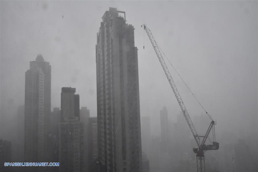 HONG KONG, septiembre 16, 2018 (Xinhua) -- Vista de edificios permaneciendo entre los fuertes vientos en Hong Kong, en el sur de China, el 16 de septiembre de 2018. La se?al de huracán No. 10, el nivel más alto de alerta, fue emitida por el Observatorio de Hong Kong a las 9:40 hora local del domingo y fue sustituida por la segunda alerta más alta, la se?al de Vendaval del Sudeste 8, a las 19:40 hora local. (Xinhua/Lui Siu Wai)