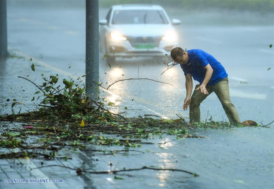 GUANGDONG, septiembre 16, 2018 (Xinhua) -- Un trabajador despeja una alcantarilla bloqueada en una vía, en el distrito de Nanshan, en Shenzhen, provincia de Guangdong, en el sur de China, el 16 de septiembre de 2018. El tifón Mangkhut aterrizó a las 17:00 del domingo en la costa de la ciudad de Jiangmen, en la provincia de Guangdong, sur de China, con vientos de hasta 162 kilómetros por hora, según la estación meteorológica provincial. Todos los vuelos en el aeropuerto de Shenzhen de Guangdong han sido cancelados hasta las 8:00 del lunes. Todos los servicios de autobús de larga distancia en la ciudad fueron suspendidos desde las 18:00 del sábado. (Xinhua/Mao Siqian)