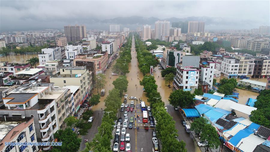 YANGCHUN, septiembre 17, 2018 (Xinhua) -- Vista aérea de una carretera inundada en la ciudad de Yangchun, provincia de Guangdong, en el sur de China, el 17 de septiembre de 2018. Una inundación causada por la lluvia golpeó Yangchun debido a la influencia del súper tifón Mangkhut. (Xinhua/Zhang Jiayang)