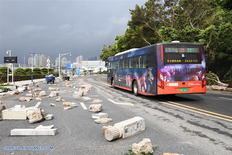 GUANGDONG, septiembre 17, 2018 (Xinhua) -- Carriles son limpiados para reanudar el transporte público en una carretera en Zhuhai, provincia de Guangdong, en el sur de China, el 17 de septiembre de 2018. El impacto del súper tifón Mangkhut en Zhuhuai está descendiendo gradualmente. Departamentos relacionados se han comprometido con la reconstrucción, y muchas compa?ías y ciudadanos participan voluntariamente en ello. El tránsito, la aduana portuaria, la electricidad y el suministro de agua están en recuperación. (Xinhua/Liang Xu)