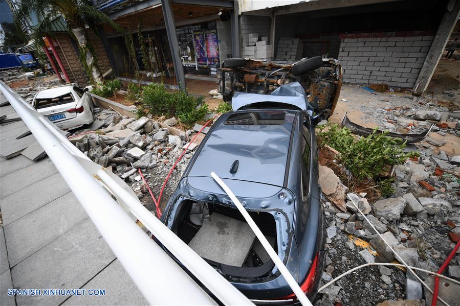 SHENZHEN, septiembre 17, 2018 (Xinhua) -- Un vehículo da?ado permanece en el distrito Yantian de Shenzhen, provincia de Guangdong, en el sur de China, el 17 de septiembre de 2018. Las autoridades meteorológicas locales cancelaron la alerta amarilla contra el tifón el lunes por la tarde. El trabajo de ayuda por desastres se puso en marcha. (Xinhua/Mao Siqian)