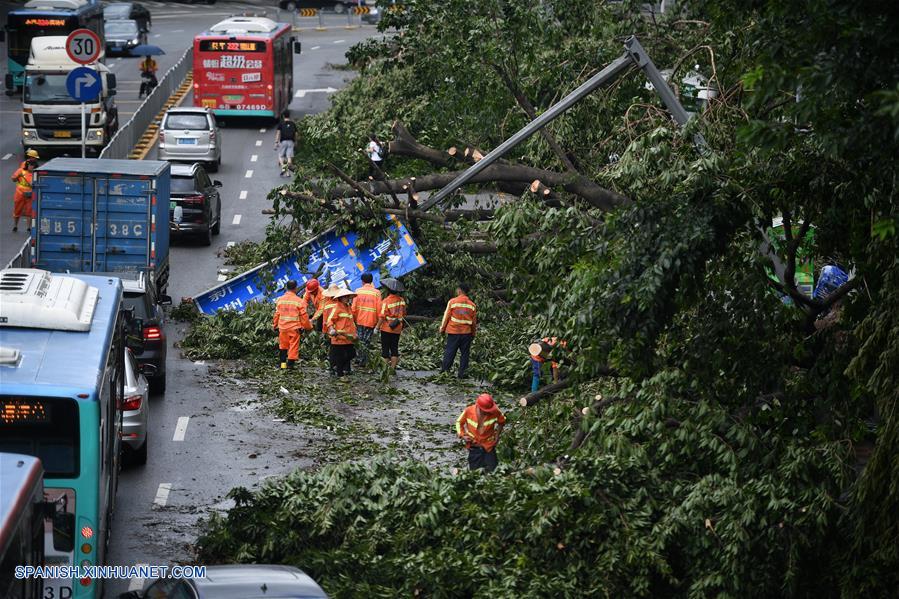 SHENZHEN, septiembre 17, 2018 (Xinhua) -- Personas limpian una calle, en el distrito Futian de Shenzhen, provincia de Guangdong, en el sur de China, el 17 de septiembre de 2018. Las autoridades meteorológicas locales cancelaron la alerta amarilla contra el tifón el lunes por la tarde. El trabajo de ayuda por desastres se puso en marcha. (Xinhua/Mao Siqian)