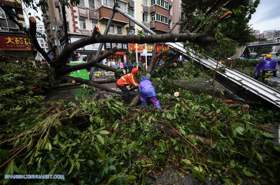 SHENZHEN, septiembre 17, 2018 (Xinhua) -- Personas levantan árboles caídos, en el distrito Futian de Shenzhen, provincia de Guangdong, en el sur de China, el 17 de septiembre de 2018. Las autoridades meteorológicas locales cancelaron la alerta amarilla contra el tifón el lunes por la tarde. El trabajo de ayuda por desastres se puso en marcha. (Xinhua/Mao Siqian)
