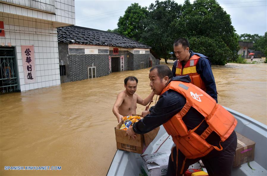 YANGCHUN, septiembre 17, 2018 (Xinhua) -- Milicianos envían bienes de ayuda para catástrofes a aldeanos en la villa Pingxi de la ciudad de Yangchun, provincia de Guangdong, en el sur de China, el 17 de septiembre de 2018. Una inundación causada por la lluvia golpeó Yangchun debido a la influencia del súper tifón Mangkhut. (Xinhua/Zhou Ke)