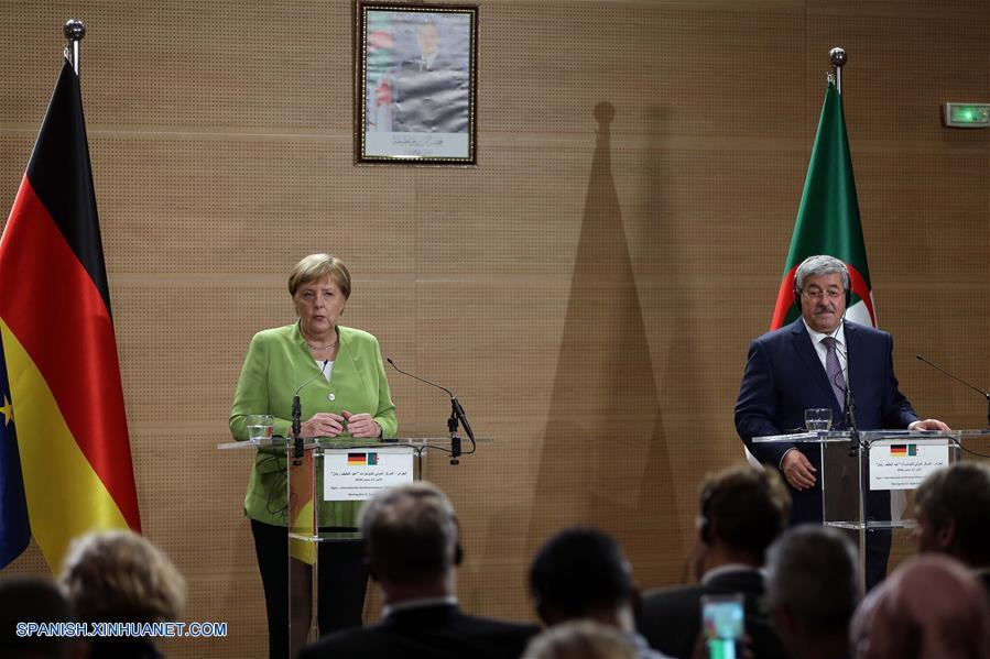 ARGEL, septiembre 17, 2018 (Xinhua) -- La canciller alemana, Angela Merkel (i-atrás) y el primer ministro argelino, Ahmed Ouyahia (d-atrás), participan en una conferencia de prensa conjunta en Argel, Argelia, el 17 de septiembre de 2018. De acuerdo con información de la prensa local, la canciller alemana Angela Merkel comenzó su visita a Argelia el lunes con conversaciones con el primer ministro Ahmed Ouyahia, donde discutieron asociación bilateral para combatir la inmigración indocumentada y el terrorismo. (Xinhua/Str)