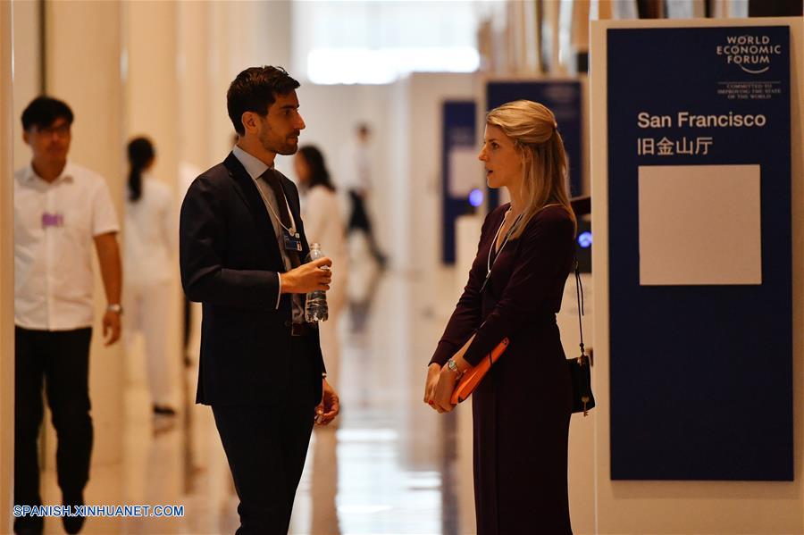 TIANJIN, septiembre 17, 2018 (Xinhua) -- Participantes del Foro Davos de Verano conversan en el Centro de Exhibiciones y Convenciones de Meijiang, en Tianjin, en el norte de China, el 17 de septiembre de 2018. Creado por el Foro Económico Mundial (FEM) en 2007, el Davos de Verano se celebra cada a?o en China. Alterna la sede entre las ciudades costeras de Dalian y Tianjin. Se espera que el foro de este a?o, con un tema de "Dar forma a las sociedades innovadoras en la cuarta revolución industrial", contará con la participación de más de 2,000 políticos, empresarios, académicos y representantes de medios de comunicación de cerca de 90 países. (Xinhua/Li Ran)