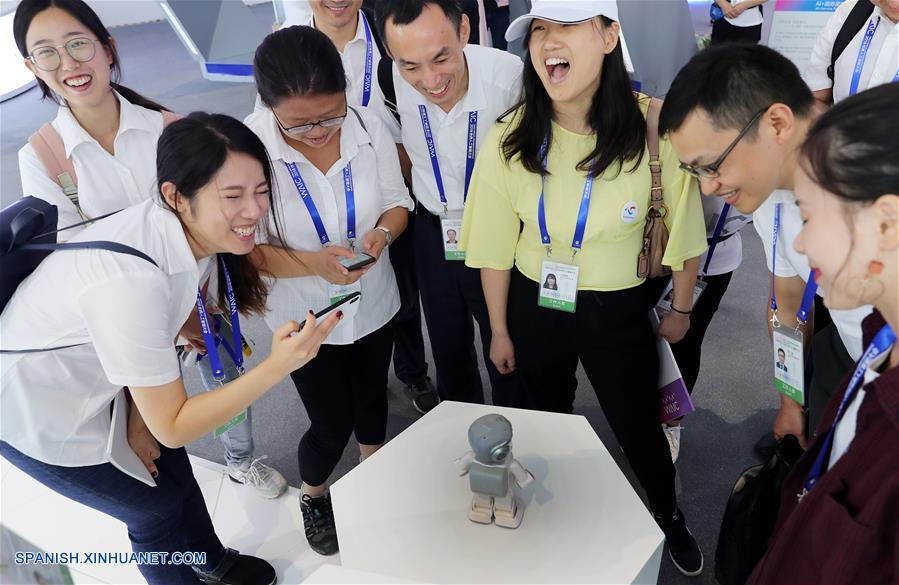 SHANGHAI, septiembre 17, 2018 (Xinhua) -- Visitantes interactúan con un robot durante la Conferencia Mundial de Inteligencia Artificial (IA) 2018, en Shanghai, en el este de China, el 17 de septiembre de 2018. El certamen, de tres días de duración, cuenta con la participación de expertos, académicos y empresarios de unos 40 países y regiones. Más de 200 grandes compa?ías de IA participan en la conferencia y en las actividades de exhibición. (Xinhua/Fang Zhe)