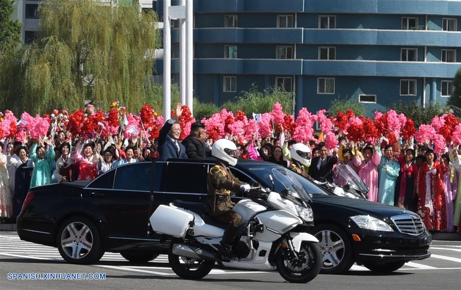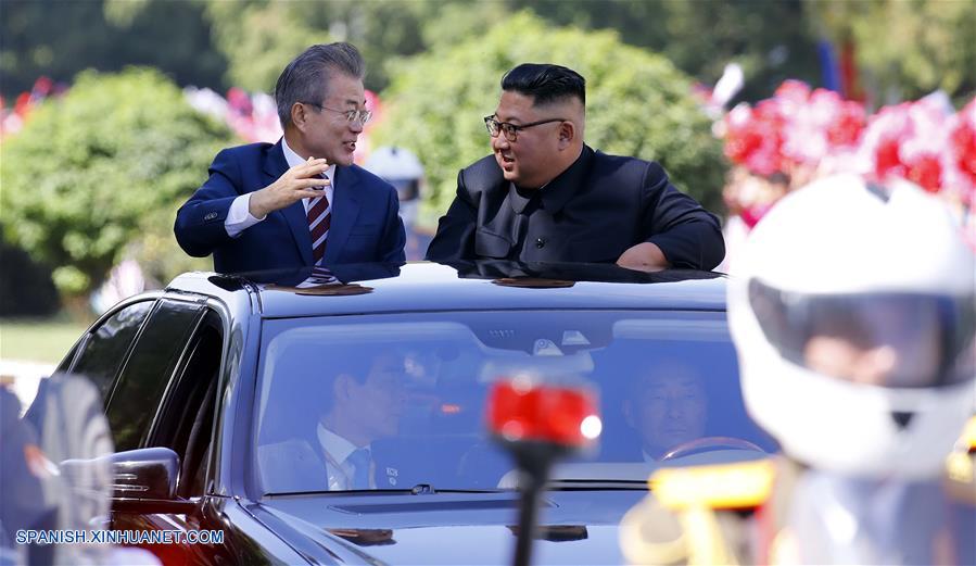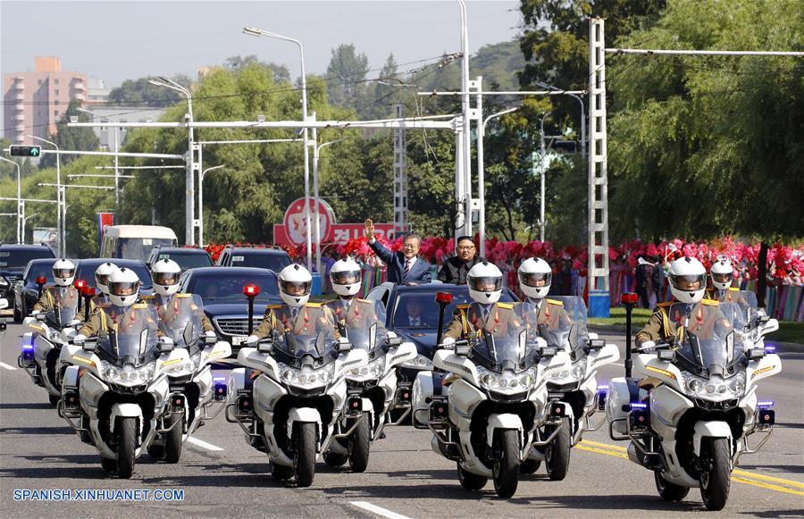 PYONGYANG, septiembre 18, 2018 (Xinhua) -- El presidente de la República de Corea, Moon Jae-in (d), y el máximo líder de la República Popular Democrática de Corea (RPDC), Kim Jong Un (i), inspeccionan la guardia de honor, en Pyongyang, RPDC, el 18 de septiembre de 2018. Moon, quien llegó a la capital de la RPDC a las 10:00 hora local (01:00 GMT), se encuentra en el país para asistir a la que será la tercera cumbre intercoreana este a?o. (Xinhua/Cuerpo de Prensa de Pyongyang)