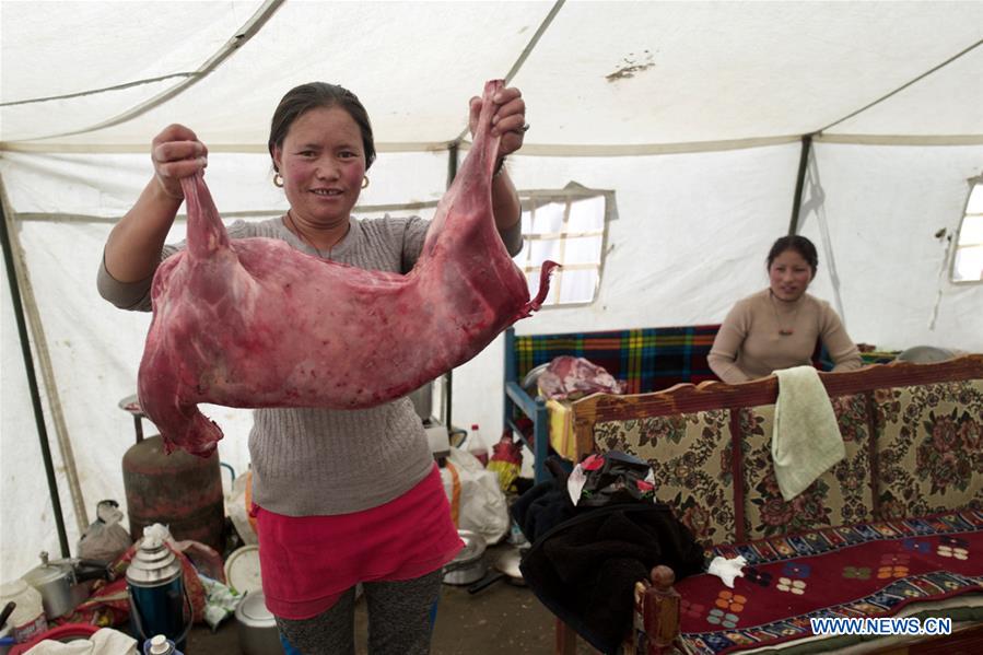 Una carnicera de Nepal muestra un cordero en venta en un campamento fronterizo en el pueblo de Yagra del condado Zhongba, en Xigaze, en la región autónoma del Tíbet, suroeste de China, el 8 de septiembre de 2018. Existe una larga historia en el comercio entre residentes de ambos lados de la frontera China-Nepal. Cada a?o, el mercado fronterizo de Yagra, en Xigaze, está abierto en junio y septiembre, y dura unos diez días. (Xinhua / Purbu Zhaxi)