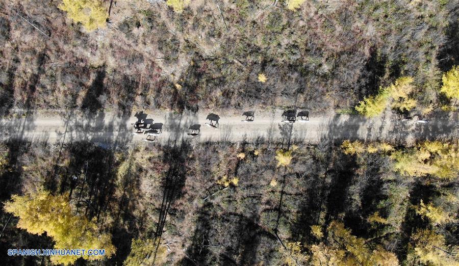 GENHE, septiembre 19, 2018 (Xinhua) -- Imagen del 18 de septiembre de 2018 de un reba?o de renos vagando en la Finca Forestal Yue'anli de la oficina forestal de Genhe en las monta?as Gran Khingan de la Región Autónoma de Mongolia Interior, en el norte de China. Los empleados de la Finca Forestal Yue'anli son responsables de la conservación y el trabajo de cría de renos en China. (Xinhua/Yu Yang)