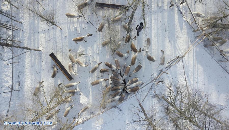 GENHE, septiembre 19, 2018 (Xinhua) -- Imagen del 23 de diciembre de 2017 del guardabosques Zhang Guohua reponiendo forraje para los renos en la Finca Forestal Yue'anli de la oficina forestal de Genhe en las monta?as Gran Khingan de la Región Autónoma de Mongolia Interior, en el norte de China. Los empleados de la Finca Forestal Yue'anli son responsables de la conservación y el trabajo de cría de renos en China. (Xinhua/Yu Yang)