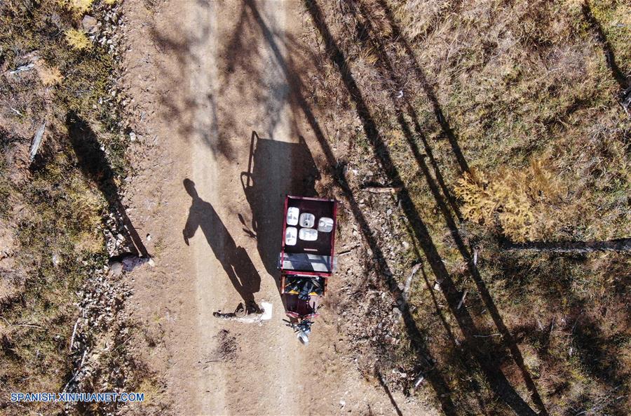 GENHE, septiembre 19, 2018 (Xinhua) -- Imagen del 18 de septiembre de 2018 de un empleado transportando agua para el uso diario desde un río en la Finca Forestal Yue'anli de la oficina forestal de Genhe en las monta?as Gran Khingan de la Región Autónoma de Mongolia Interior, en el norte de China. Los empleados de la Finca Forestal Yue'anli son responsables de la conservación y el trabajo de cría de renos en China. (Xinhua/Li Renzi)