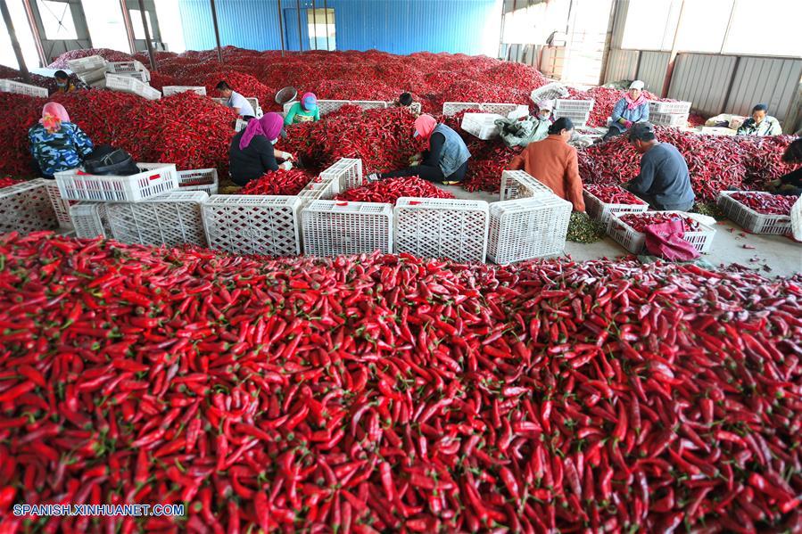 JILIN, septiembre 19, 2018 (Xinhua) -- Granjeros escogen chiles en el condado Tongyu de Baicheng, en la provincia de Jilin, en el noreste de China, el 19 de septiembre de 2018. La temporada local de cosecha de chiles llega en oto?o. (Xinhua/Zhang Nan)