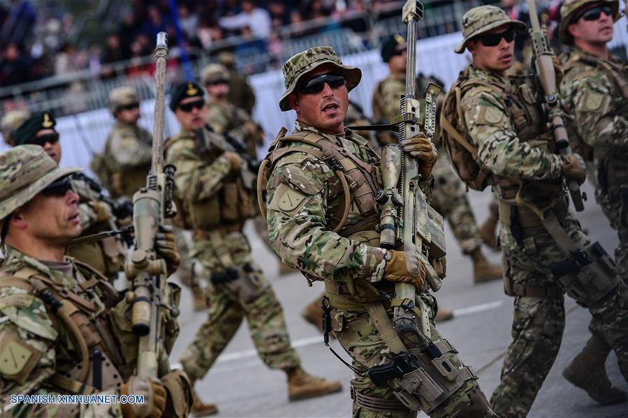 SANTIAGO, septiembre 19, 2018 (Xinhua) -- Elementos de las Fuerzas Armadas chilenas participan durante la Gran Parada Militar en conmemoración del Día de las Glorias del Ejército, en el Parque O'Higgins, en Santiago, capital de Chile, el 19 de septiembre de 2018. El presidente de Chile, Sebastián Pi?era, presidió el miércoles la tradicional Parada Militar en la que unos 9,000 efectivos de todas las unidades castrenses marcharon para conmemorar el Día de las Glorias del Ejército chileno, que en este 2018 destacó por el protagonismo de las mujeres uniformadas. (Xinhua/Jorge Villegas)