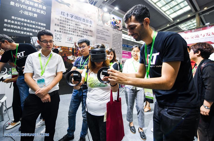 GUANGDONG, septiembre 20, 2018 (Xinhua) -- Una visitante (2-d) aprende acerca de las prácticas médicas usando un dispositivo de Realidad Virtual en el área de exposición del Comité Internacional de la Cruz Roja (ICRC, por sus siglas en inglés) durante la Sexta Feria de la Beneficencia de China (CCF, por sus siglas en inglés), en Shenzhen, provincia de Guangdong, en el sur de China, el 20 de septiembre de 2018. Centrándose en el alivio de la caridad, el evento de tres días de duración comenzó el jueves en el Centro de Convenciones y Exposiciones de Shenzhen. (Xinhua/Mao Siqian)