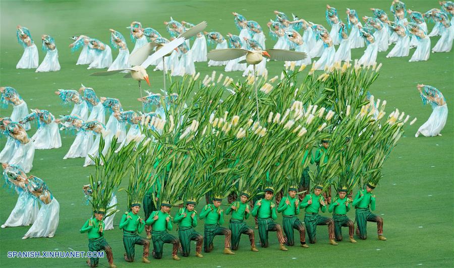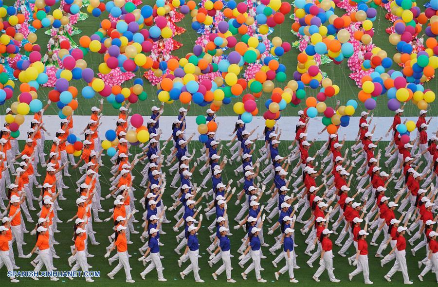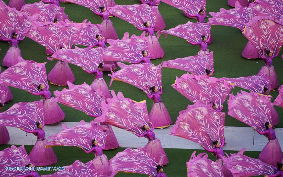 YINCHUAN, septiembre 20, 2018 (Xinhua) -- Personas realizan una presentación durante una gran reunión llevada a cabo para celebrar el 60 aniversario de la fundación de la Región Autónoma Hui de Ningxia, en el Estadio Monta?a Helan, en Yinchuan, capital de la Región Autónoma Hui de Ningxia, en el noroeste de China, el 20 de septiembre de 2018. (Xinhua/Chen Jianli)