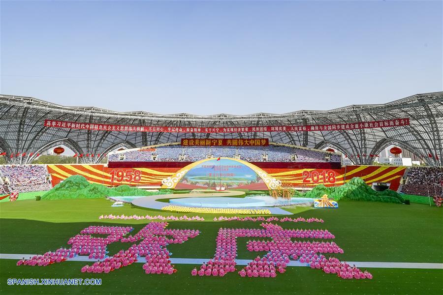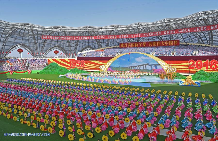 YINCHUAN, septiembre 20, 2018 (Xinhua) -- Personas realizan una presentación durante una gran reunión llevada a cabo para celebrar el 60 aniversario de la fundación de la Región Autónoma Hui de Ningxia, en el Estadio Monta?a Helan, en Yinchuan, capital de la Región Autónoma Hui de Ningxia, en el noroeste de China, el 20 de septiembre de 2018. (Xinhua/Shen Bohan)