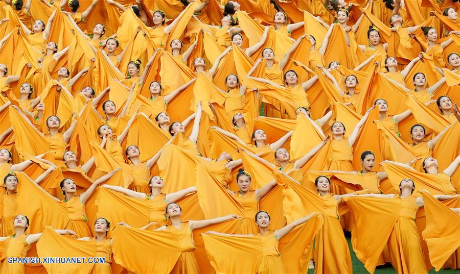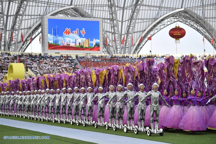 YINCHUAN, septiembre 20, 2018 (Xinhua) -- Personas realizan una presentación durante una gran reunión llevada a cabo para celebrar el 60 aniversario de la fundación de la Región Autónoma Hui de Ningxia, en el Estadio Monta?a Helan, en Yinchuan, capital de la Región Autónoma Hui de Ningxia, en el noroeste de China, el 20 de septiembre de 2018. (Xinhua/Zhang Ling)
