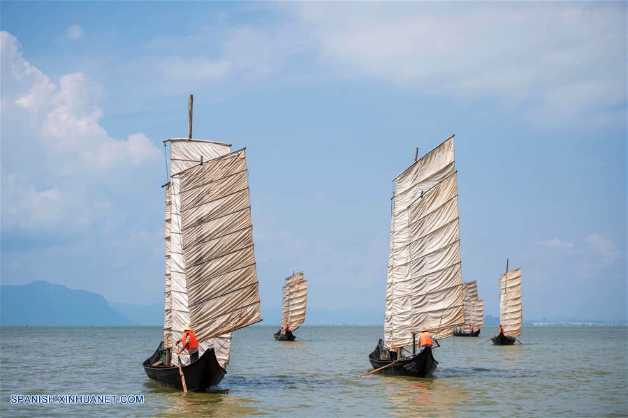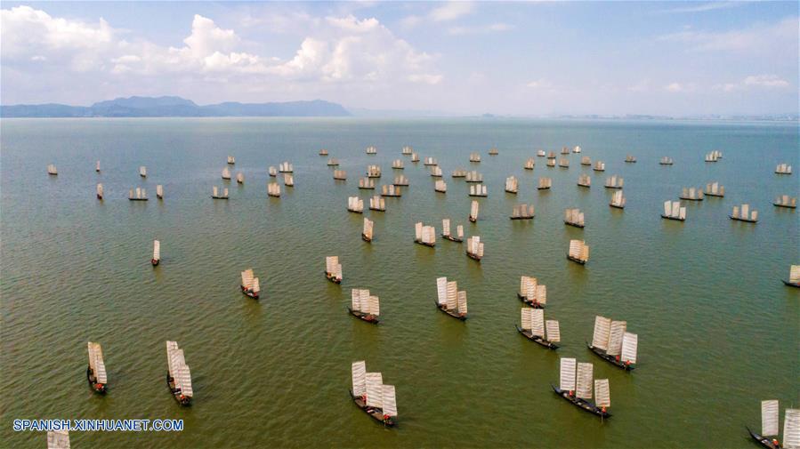 KUNMING, septiembre 23, 2018 (Xinhua) -- Botes pesqueros navegan en el Lago Dianchi en Kunming, en la provincia de Yunnan, en el suroeste de China, el 23 de septiembre de 2018. Recientemente, el Lago Dianchi entró en su temporada de pesca. (Xinhua/Hu Chao)