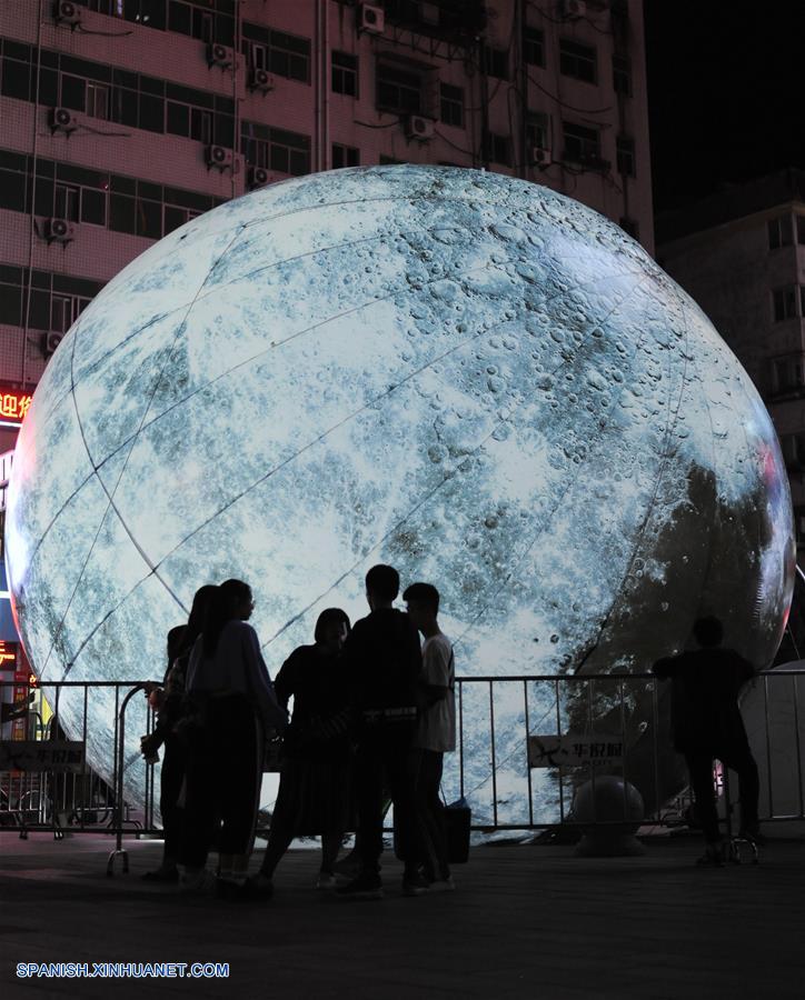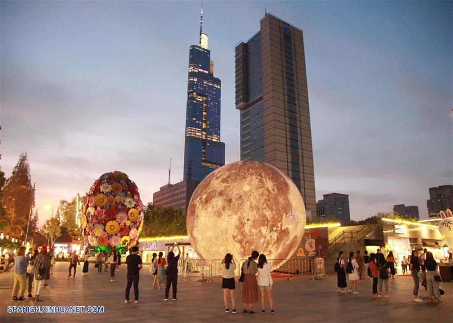 NANJING, septiembre 23, 2018 (Xinhua) -- Personas observan una instalación de una luna para conmemorar el próximo Festival de Medio Oto?o, en una plaza en Nanjing, en la provincia de Jiangsu, en el este de China, el 23 de septiembre de 2018. (Xinhua/Liu Jianhua)