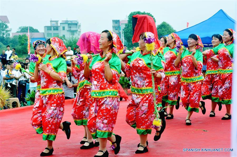 JIANGXI, septiembre 24, 2018 (Xinhua) -- Imagen del 23 de septiembre de 2018 de aldeanas bailando para celebrar el Festival de Medio Oto?o y el próximo Día Nacional de China, en la villa Longling del condado de Poyang, provincia de Jiangxi, en el este de China. (Xinhua/Zhuo Zhongwei)