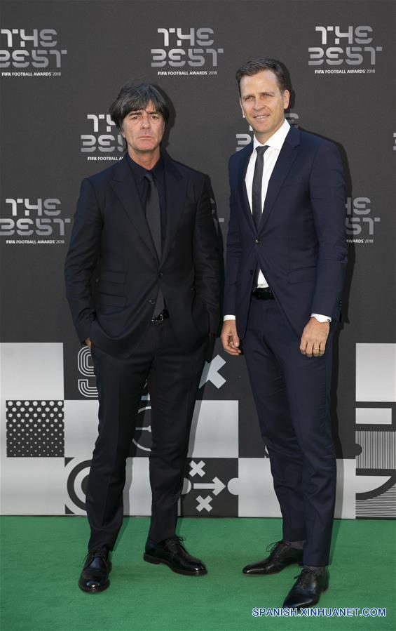 El director técnico, Joachim Loew (i), y el exjugador alemàn, Oliver Bierhoff (d), llegan a la alfombra verde previo a los Premios "The Best FIFA 2018" en Londres, Reino Unido, el 24 de septiembre de 2018. (Xinhua/Han Yan)