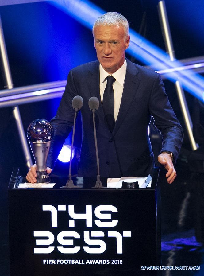 LONDRES, septiembre 24, 2018 (Xinhua) -- El director técnico, Didier Deschamps, de la selección nacional de Francia, recibe el trofeo a Mejor Entrenador 2018 durante los Premios "The Best FIFA 2018" en Londres, Reino Unido, el 24 de septiembre de 2018. (Xinhua/Han Yan)
