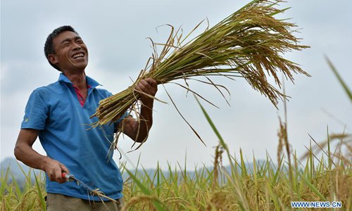 Zunyi,Guizhou,26/09/2018(El Pueblo en Línea)-Un agricultor cosecha arroz en un campo del municipio Hailong, en Honghuagang, Zunyi, provincia de Guizhou. Hailong, reconocida por su producción de arroz, ha realizado grandes esfuerzos por mejorar la calidad de los cultivos y ampliar los canales de comercialización. 23 de septiembre del 2017. (Foto: Xinhua/ Luo Xinghan)