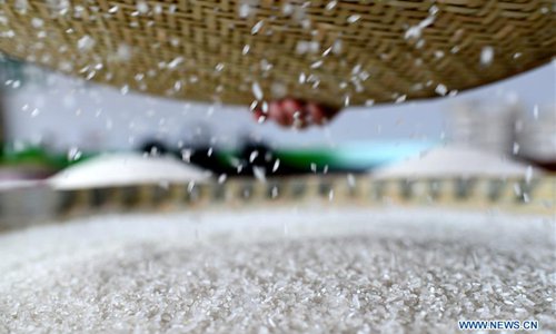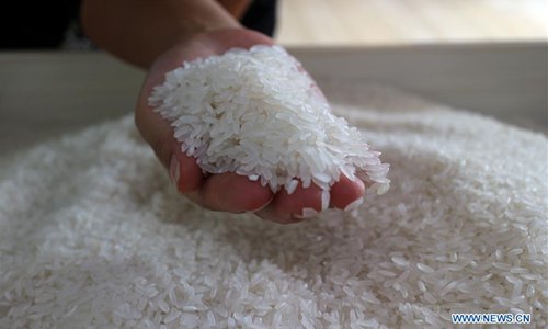 Un trabajador del municipio Hailong, en Honghuagang, Zunyi, provincia de Guizhou, comprueba la calidad del arroz para su venta en las plataformas de comercio electrónico. Hailong, reconocida por su producción de arroz, ha realizado grandes esfuerzos para mejorar la calidad del arroz y ampliar los canales de comercialización. 8 de octubre del 2018.(Foto: Xinhua/ Luo Xinghan)