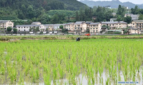 Un agricultor del municipio Hailong, en Honghuagang, Zunyi, provincia de Guizhou, planta arroz para su venta en las plataformas de comercio electrónico. Hailong, reconocida por su producción de arroz, ha realizado grandes esfuerzos para mejorar la calidad del arroz y ampliar los canales de comercialización. 2 de junio del 2018.(Foto: Xinhua/ Luo Xinghan)