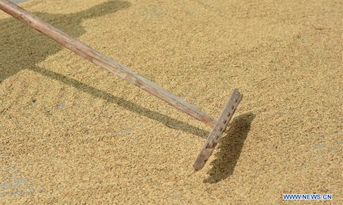 Un agricultor del municipio Hailong, en Honghuagang, Zunyi, provincia de Guizhou, rastrilla el arroz para su venta en las plataformas de comercio electrónico. Hailong, reconocida por su producción de arroz, ha realizado grandes esfuerzos para mejorar la calidad del arroz y ampliar los canales de comercialización. 23 de septiembre del 2018.(Foto: Xinhua/ Luo Xinghan)
