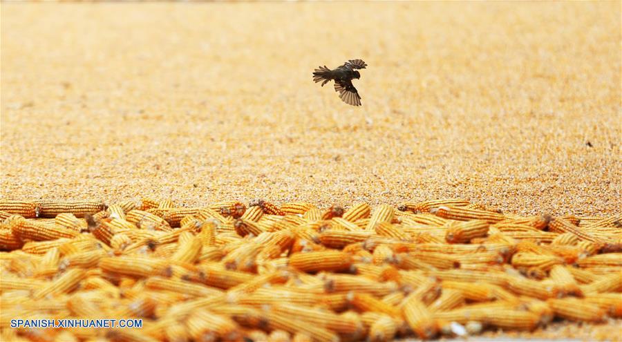 SHANDONG, septiembre 25, 2018 (Xinhua) -- Un pájaro vuela sobre el maíz, en la villa de Hongshi de la ciudad de Linyi, provincia de Shandong, en el este de China, el 25 de septiembre de 2018. (Xinhua/Zhang Chunlei)