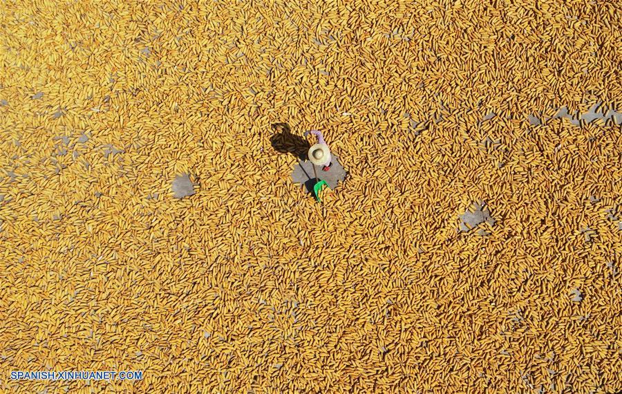 SHANDONG, septiembre 25, 2018 (Xinhua) -- Imagen del 23 de septiembre de 2018 de una vista aérea de un residente secando el maíz, en la villa de Xintun de la ciudad de Linyi, provincia de Shandong, en el este de China. (Xinhua/Zhang Chunlei)