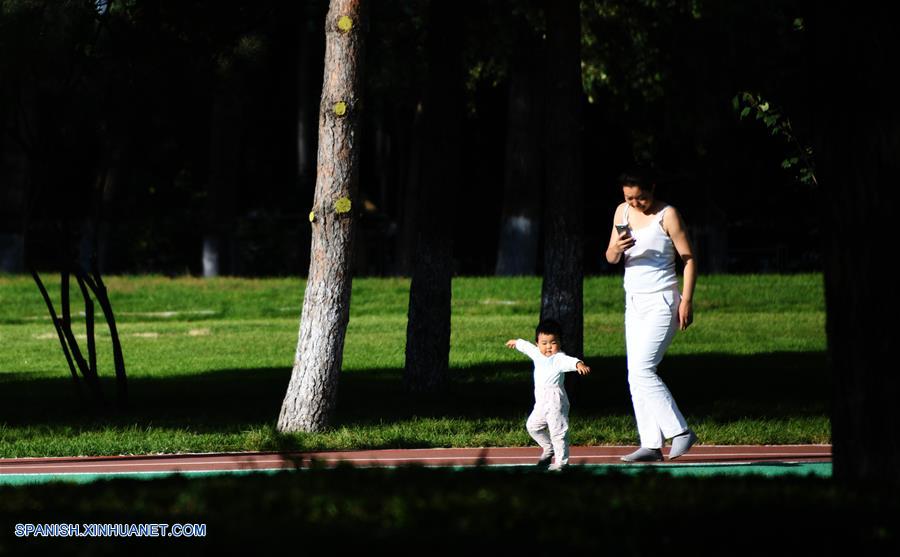 HEILONGJIANG, septiembre 25, 2018 (Xinhua) -- Una mujer realiza una caminata con su bebé en el Parque Xiangjiang, en Harbin, provincia de Heilongjiang, en el noreste de China, el 25 de septiembre de 2018. El Parque Xiangjiang, renovado de un campo de golf, ha sido abierto gratis desde el martes al público. (Xinhua/Wang Jianwei)