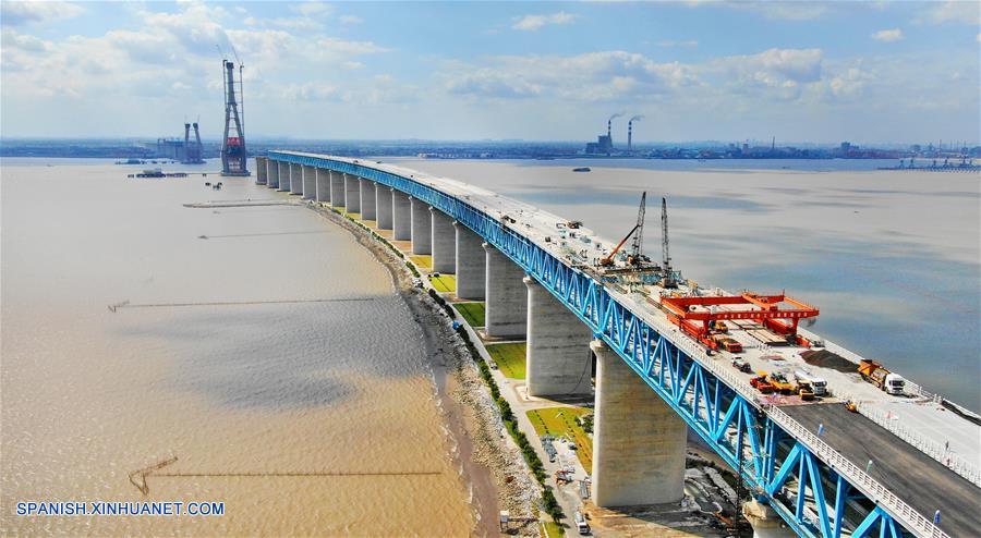 JIANGSU, septiembre 25, 2018 (Xinhua) -- Vista aérea de trabajadores pavimentando el asfalto sobre la superficie del Puente Ferroviario Shanghai-Nantong a través del Río Yangtze, en Nantong, provincia de Jiangsu, en el este de China, el 25 de septiembre de 2018. El puente, cuyo tramo principal tiene una envergadura de 1,092 metros, es un puente ferroviario suspendido por cable que conecta a Nantong y Zhangjiagang en la provincia de Jiangsu. El trabajo de pavimentación de asfalto del puente comenzó el martes en Nantong. (Xinhua/Xu Congjun)