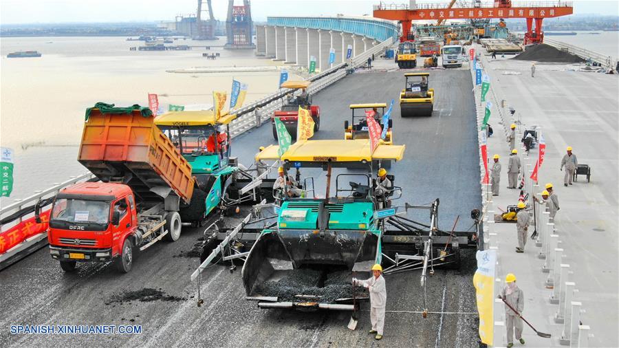 JIANGSU, septiembre 25, 2018 (Xinhua) -- Trabajadores pavimentan el asfalto sobre la superficie del Puente Ferroviario Shanghai-Nantong a través del Río Yangtze, en Nantong, provincia de Jiangsu, en el este de China, el 25 de septiembre de 2018. El puente, cuyo tramo principal tiene una envergadura de 1,092 metros, es un puente ferroviario suspendido por cable que conecta a Nantong y Zhangjiagang en la provincia de Jiangsu. El trabajo de pavimentación de asfalto del puente comenzó el martes en Nantong. (Xinhua/Xu Congjun)