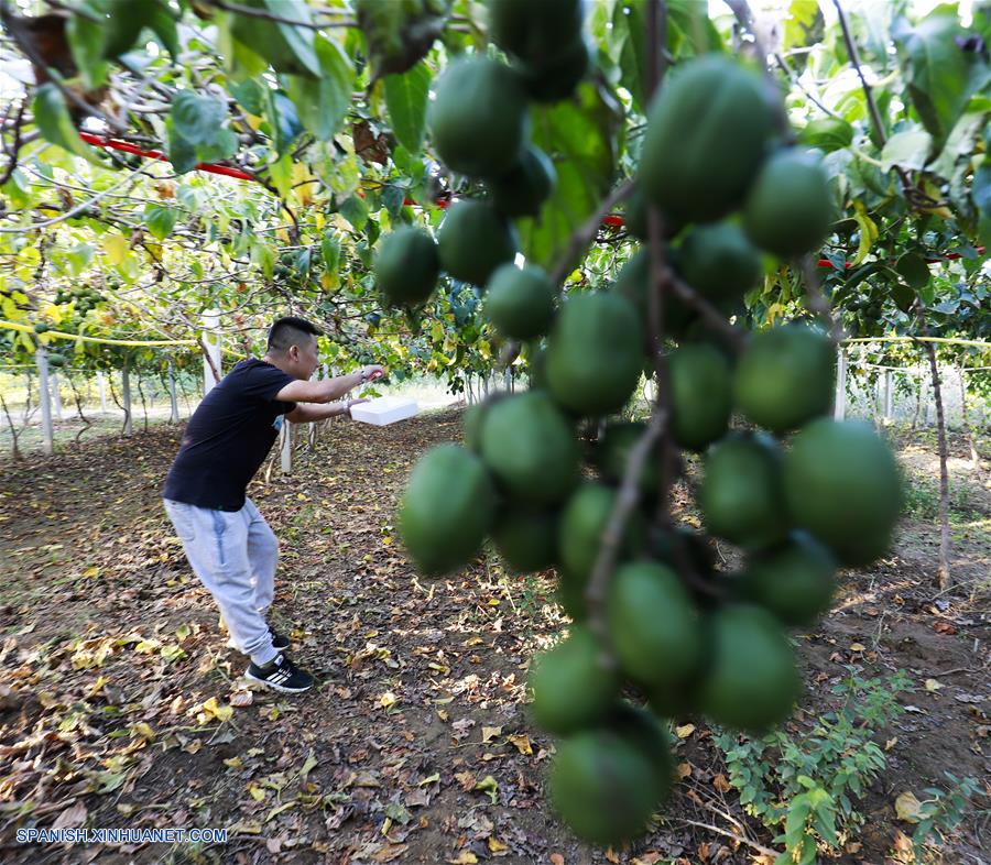HEBEI, septiembre 25, 2018 (Xinhua) -- Imagen del 24 de septiembre de 2018 de un agricultor cosechando kiwis, en la villa de Shanligezhuang del municipio de Piaozhuang en la ciudad de Zunhua, provincia de Hebei, en el norte de China. (Xinhua/Liu Mancang)
