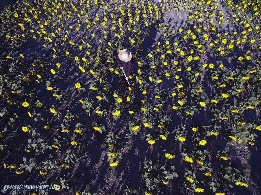 HEBEI, septiembre 25, 2018 (Xinhua) -- Imagen del 24 de septiembre de 2018 de una vista aérea de un agricultor trabajando en los campos de cultivo de girasol, en la villa de Jingziyu del municipio de Xiaochang en la ciudad de Zunhua, provincia de Hebei, en el norte de China. (Xinhua/Liu Mancang)
