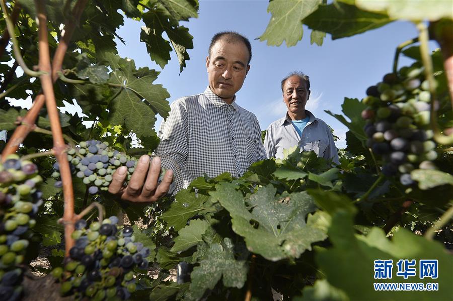 Un técnico comprueba las uvas plantadas por los inmigrantes locales en una base de Hongsibao, Wuzhong, Región Autónoma Ningxia Hui, 30 de agosto del 2016. [Foto: Xinhua]