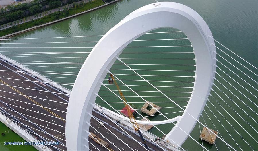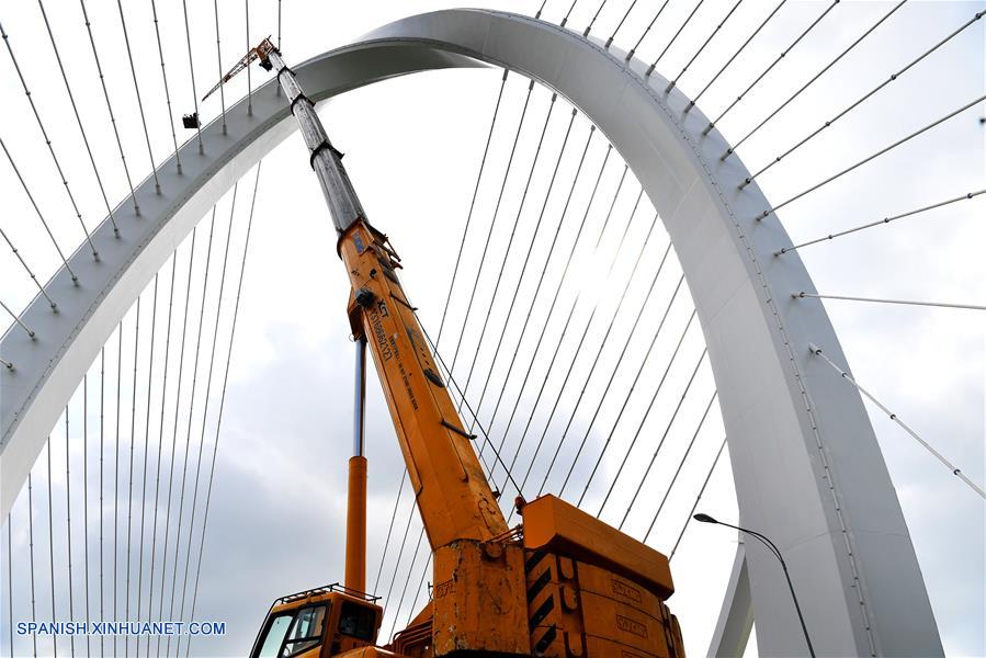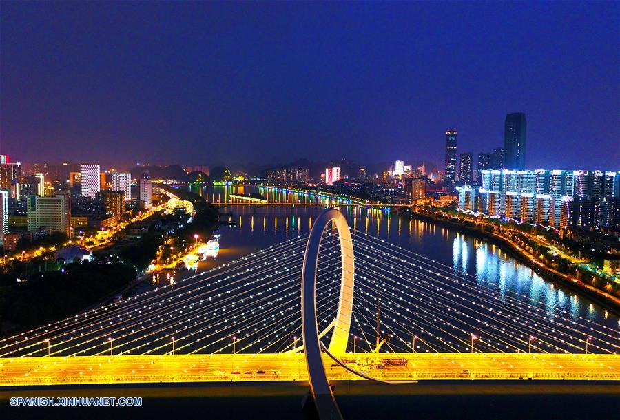 GUANGXI, septiembre 28, 2018 (Xinhua) -- Imagen del 26 de septiembre de 2018 de trabajadores probando la luces en el puente Baisha, en Liuzhou, en la Región Autónoma Zhuang de Guangxi, en el sur de China. El puente Baisha fue puesto en operación el viernes. El puente de 1,920 metros de largo y 38 de ancho comenzó a construirse en mayo de 2015. (Xinhua/Li Hanchi)